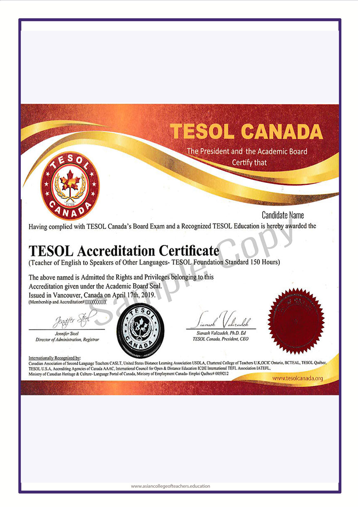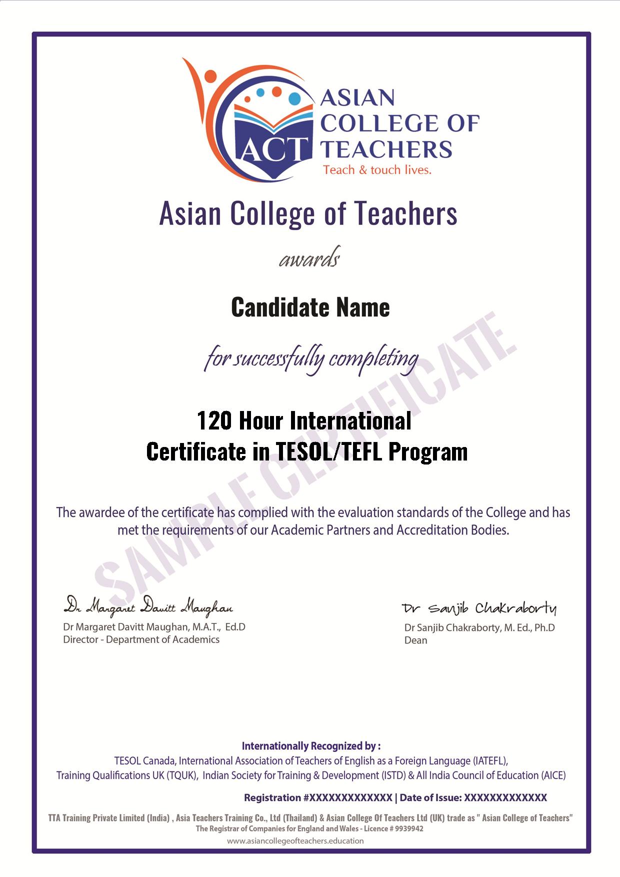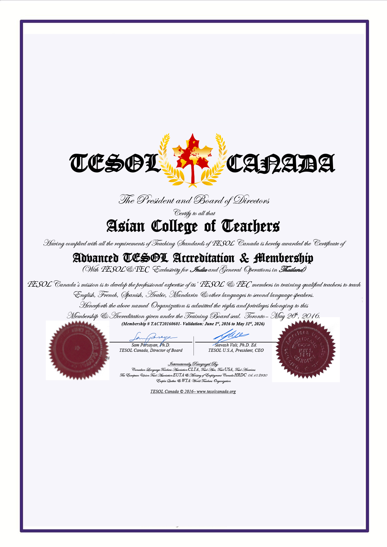 Internationally TESOL Canada is an associated member of TESOL U.S.A., TESOL European Union EUTA, TESOL Asia, TESOL Middle East and TESOL South America. ALL ACT TESOL / TEFL Certificate, approved by TESOL Canada & TESOL U.S.A and certified through the Canadian Government." All ACT TEFL qualified students can also apply for TESOL Board exam through TESOL Canada to receive an exclusive TESOL Certificate certified and notarized by Canada and USA government.